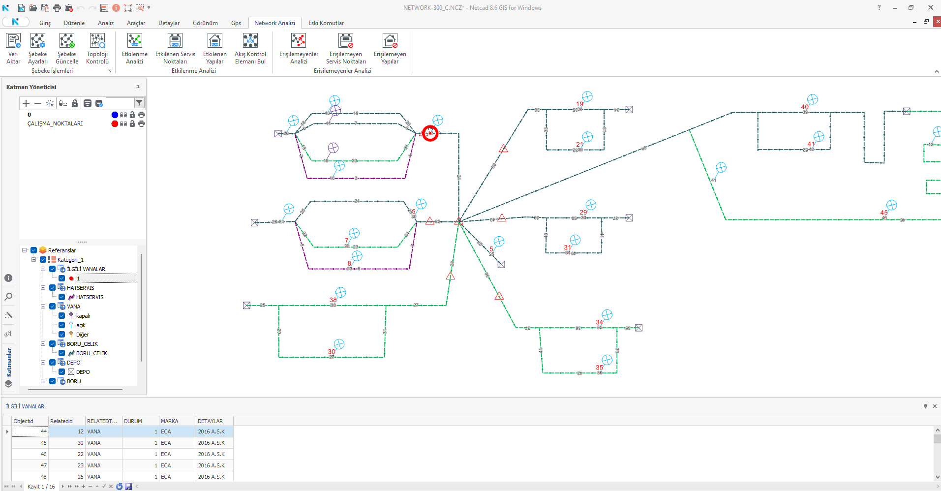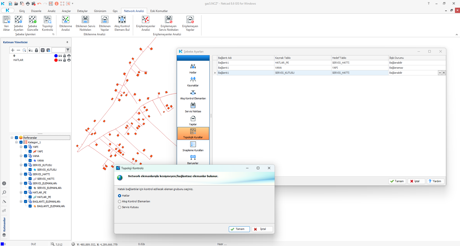 Проверяет, находятся ли линии, сервисные точки и управляющие элементы потока, определённые в сети, в правильных позициях на плане сети, чтобы предотвратить ошибочные результаты анализа.
