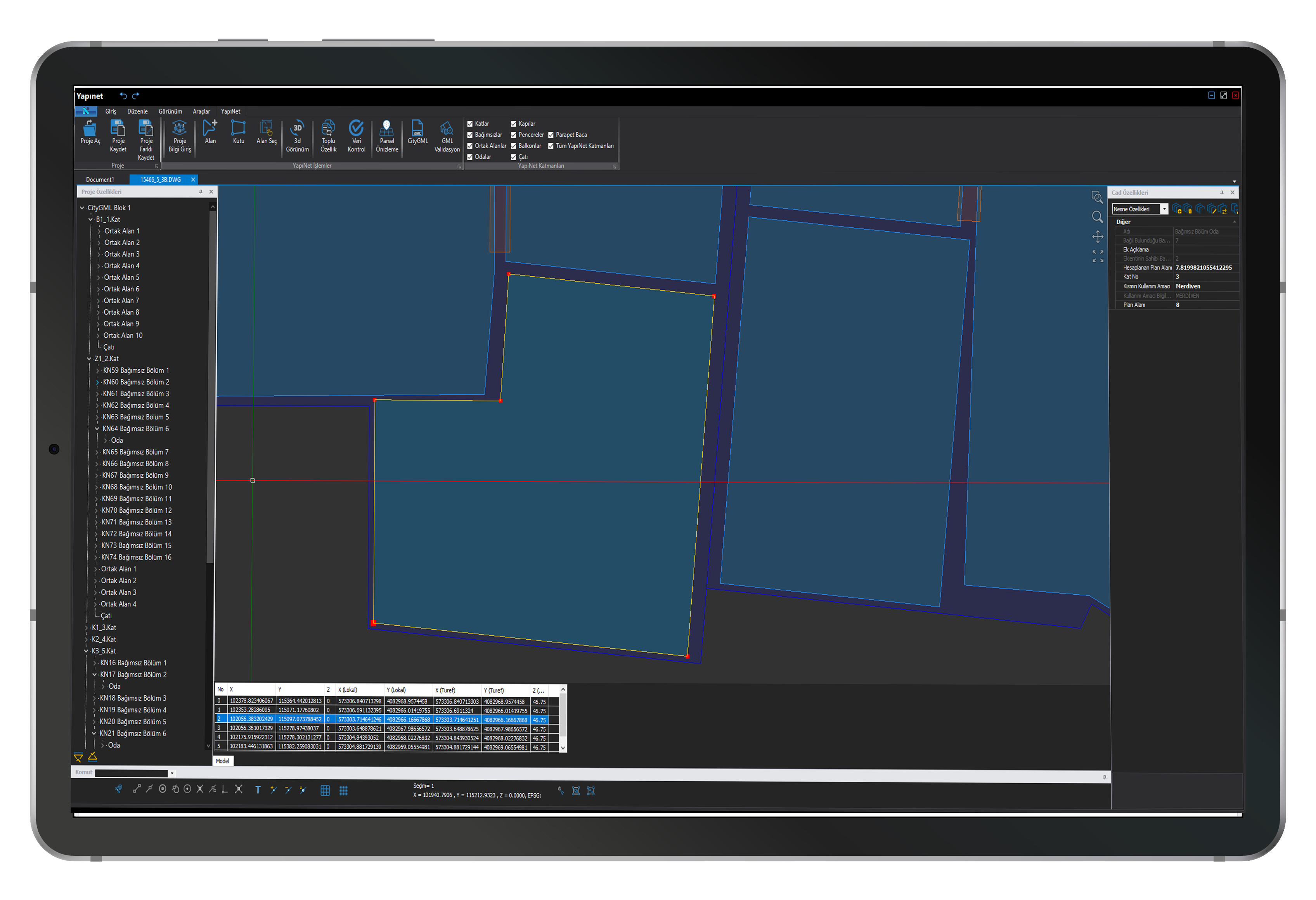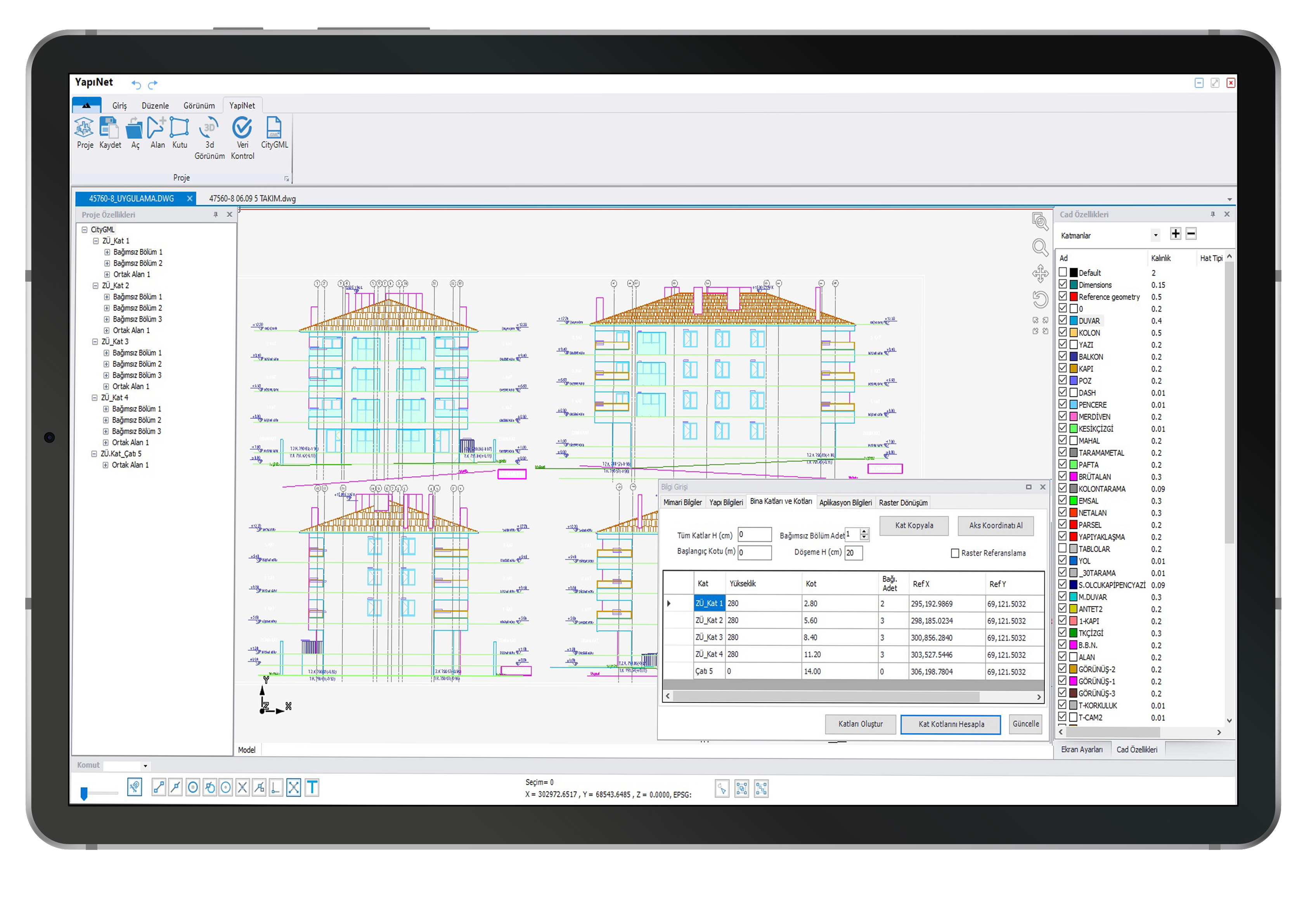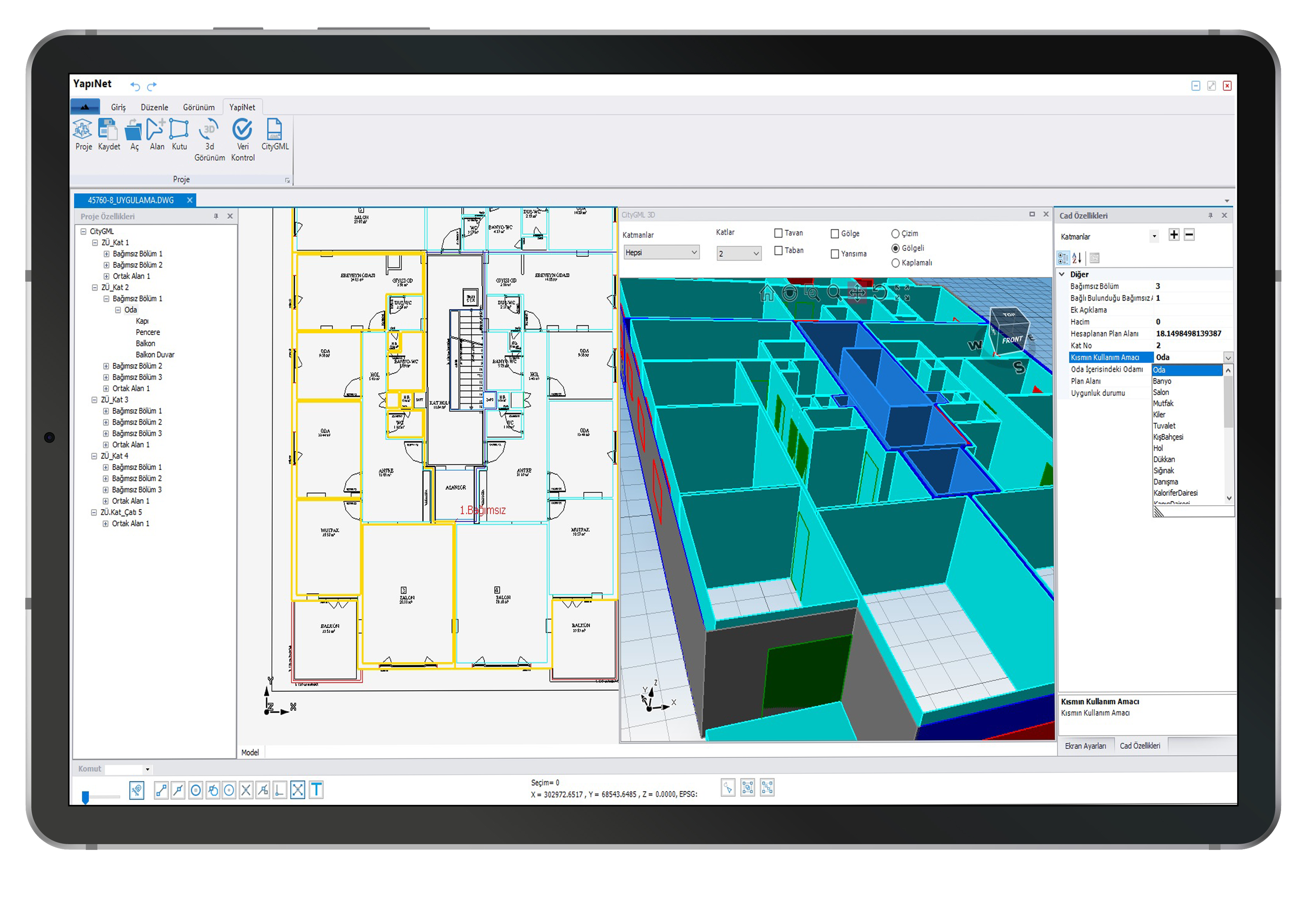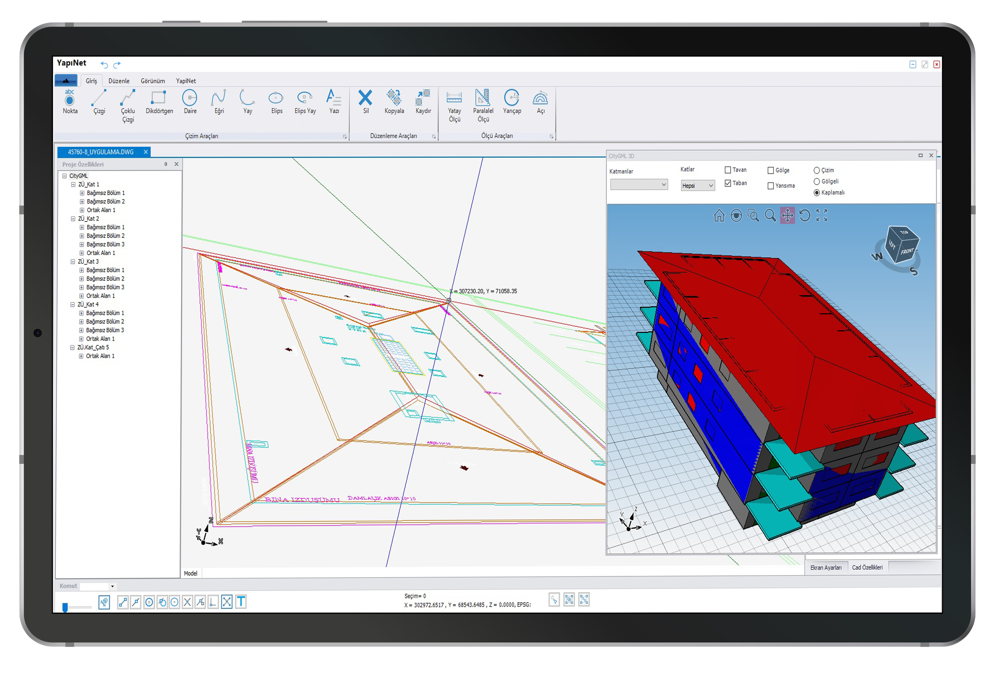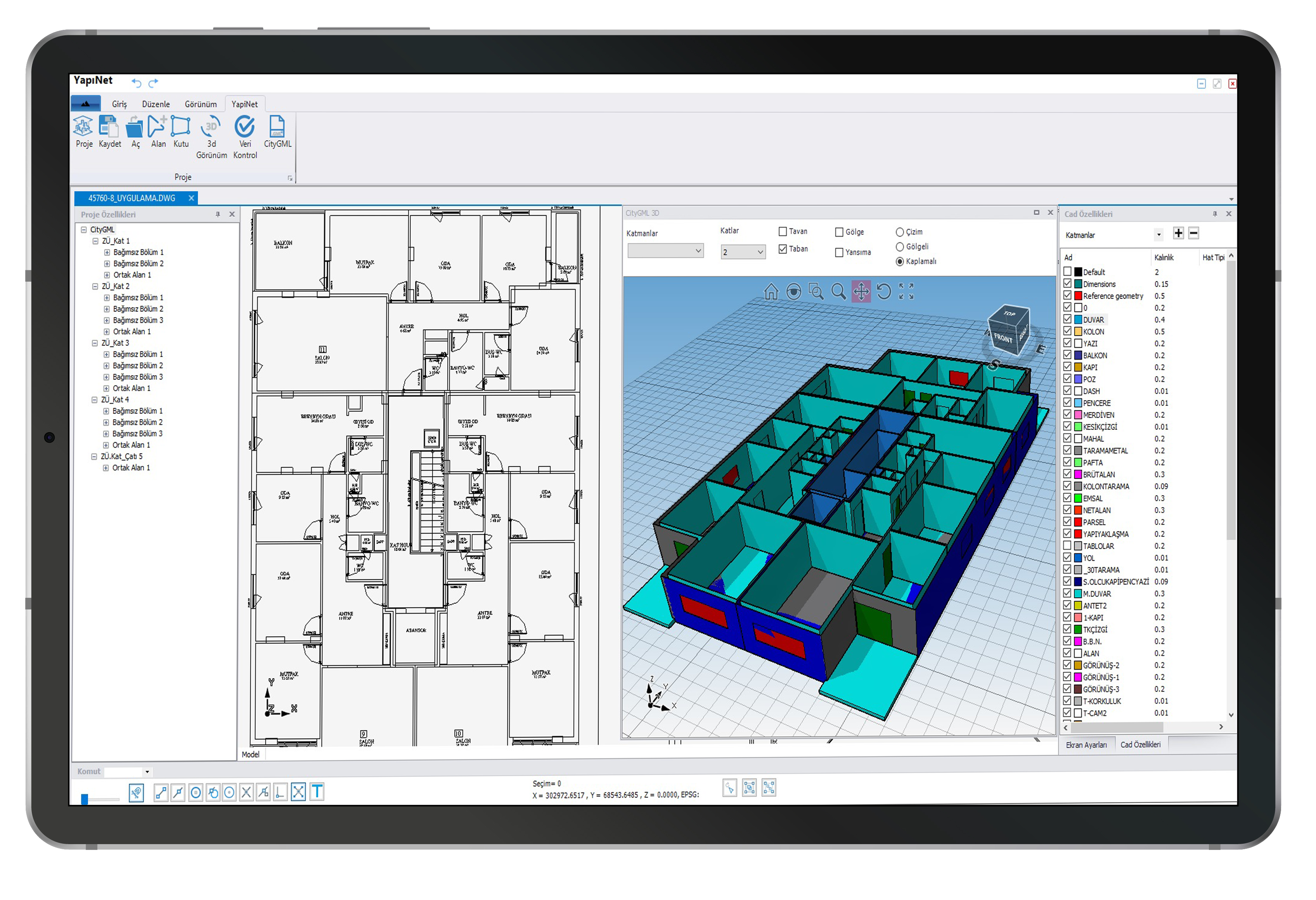 Проекты, созданные с помощью Yapınet, полностью совместимы со стандартными 3D-чертежами, базами данных и структурами слоев, указанными Главным управлением земельного кадастра для формата файлов CityGML.