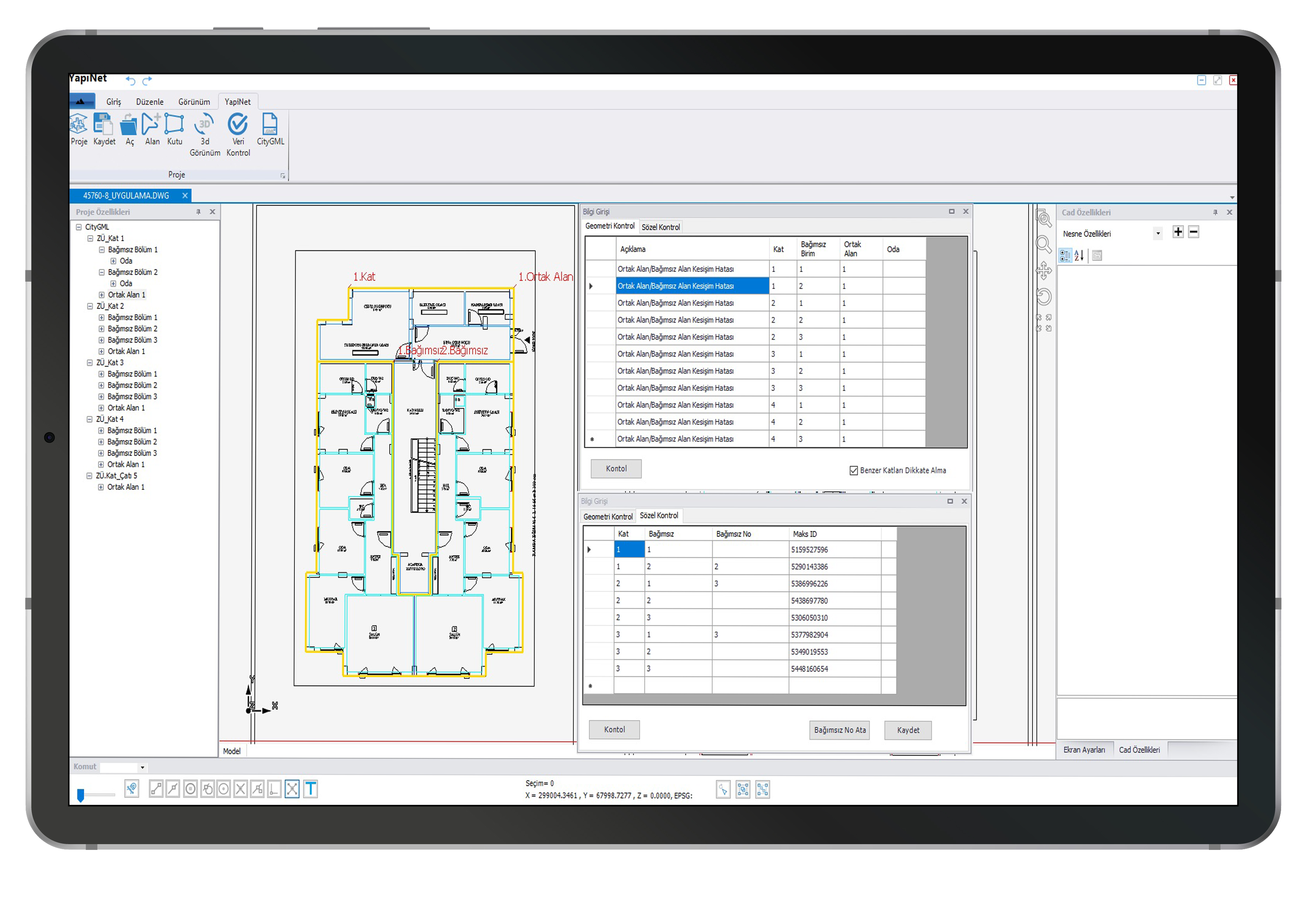 Теперь ошибки валидации в проектах можно просматривать непосредственно на странице проекта Yapınet. Это упрощает выявление и исправление ошибок. Координаты неисправного объекта можно отслеживать графически.